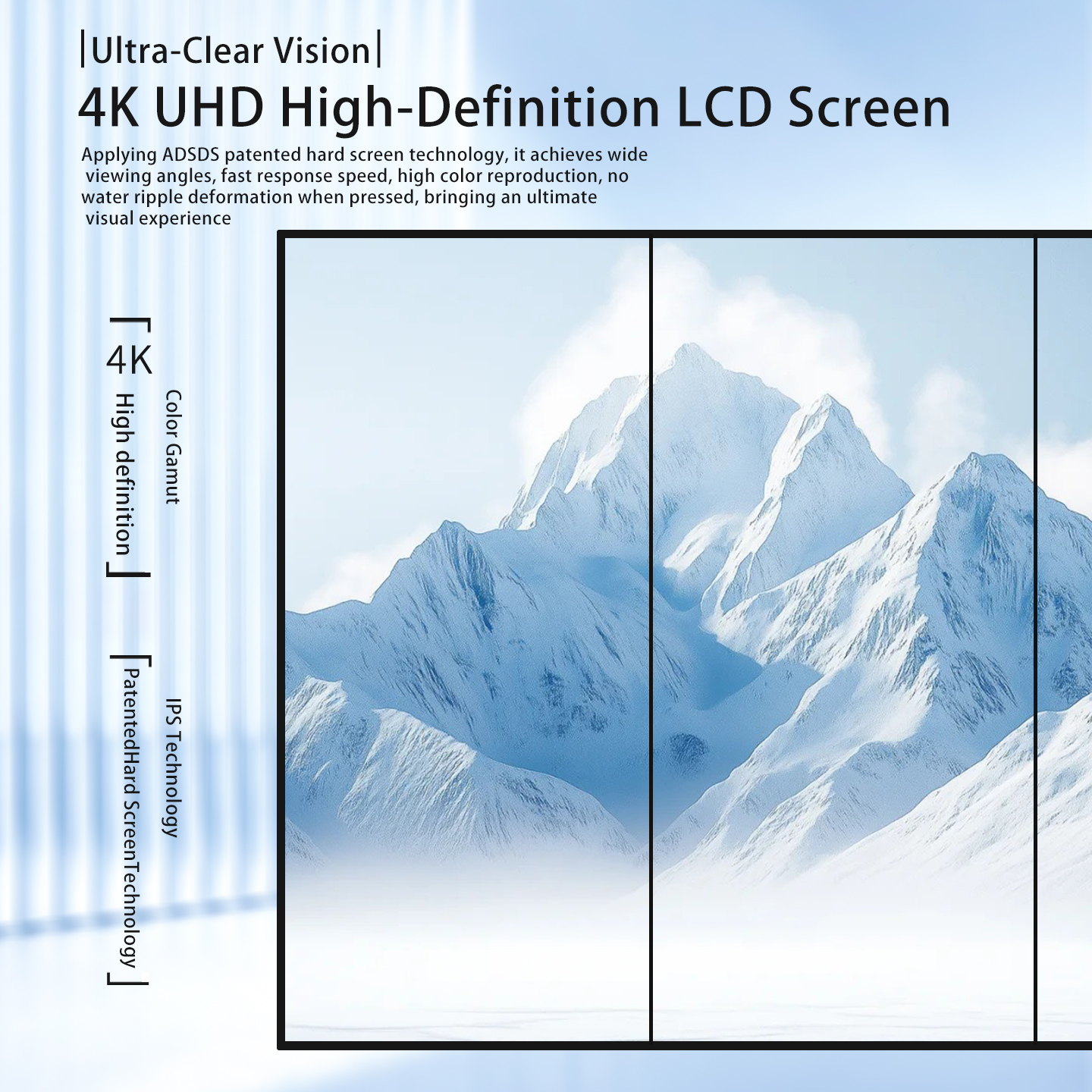 VeeLuame Advertising Display System features 4K UHD clarity, 10.4mm ultra-narrow bezel, and explosion-proof tempered glass. With dual PC/mobile control, cloud remote sync, and multi-material overlay playback, it supports 6-screen splicing. Equipped with ADSDS hard screen tech, it offers wide viewing angles and smooth dynamic images, plus one-stop hardware, software and custom material services.